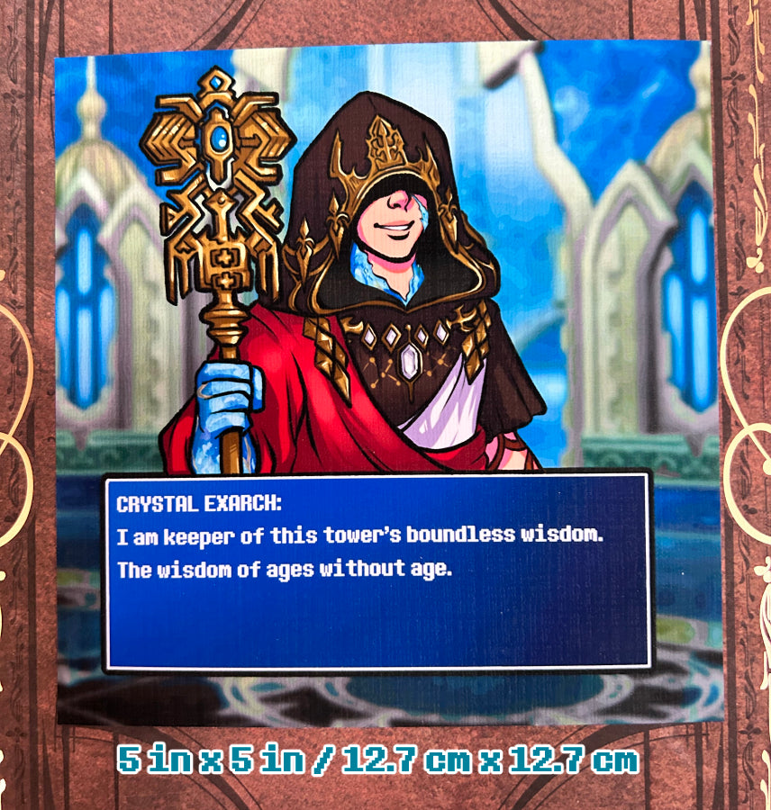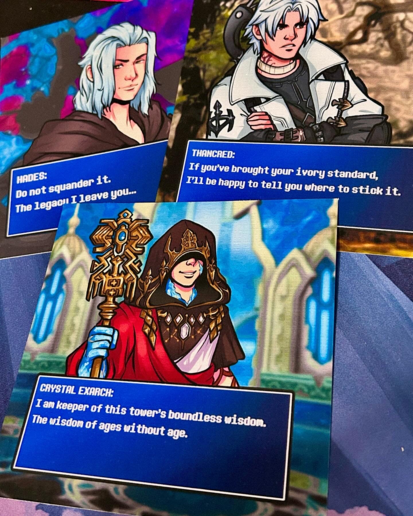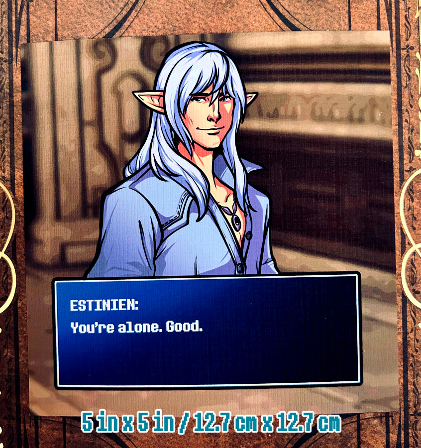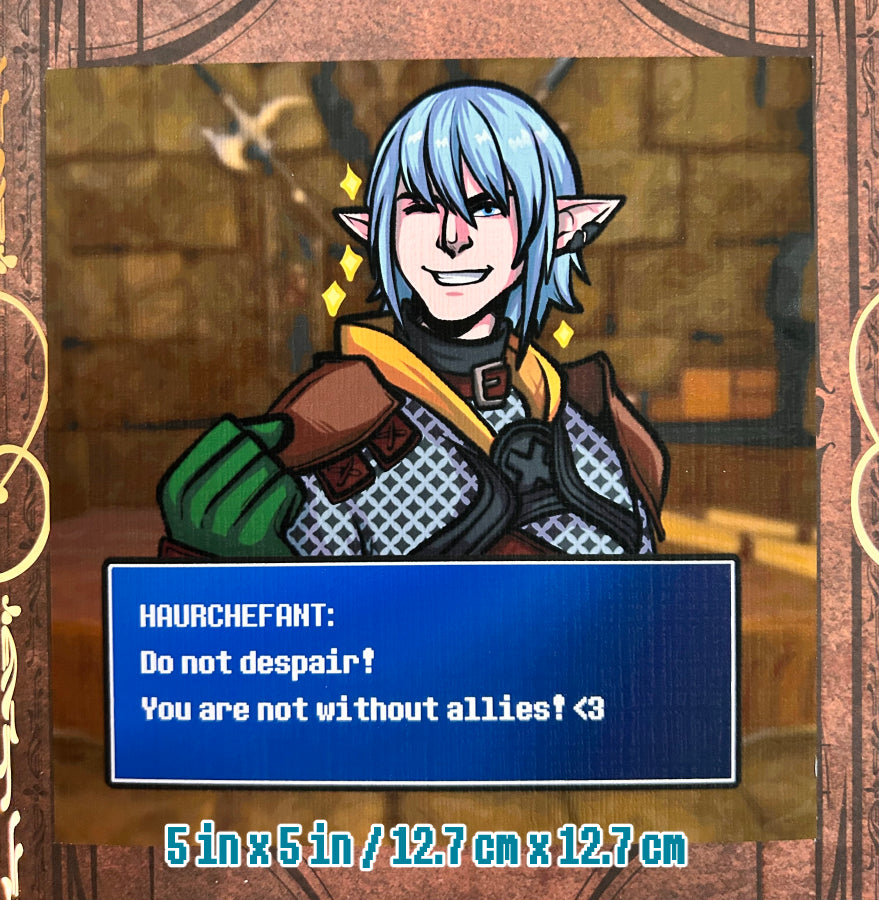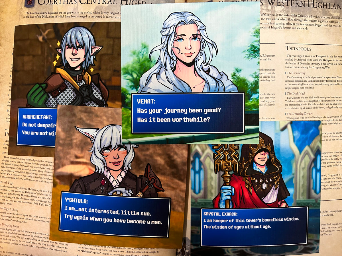 5x5" matte linen print of various Final Fantasy XIV NPCs with a classic Final Fantasy Dialogue blue box.