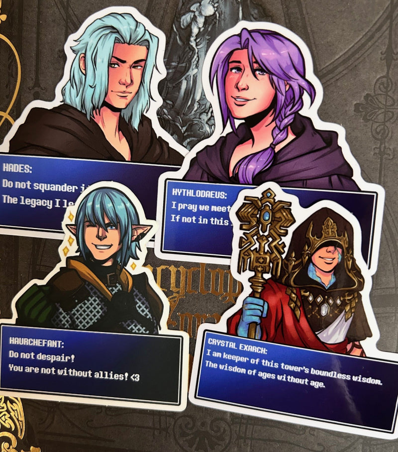 💚 FFXIV Stickers of various NPCs with quotes in a classic Final Fantasy style chatbox. Stickers vary in size, but are roughly ~3inches in size. MIX AND MATCH FOUR (be sure to list what four you want in the notes! If one of your chosen stickers is sold out, I will reach out before shipment!)