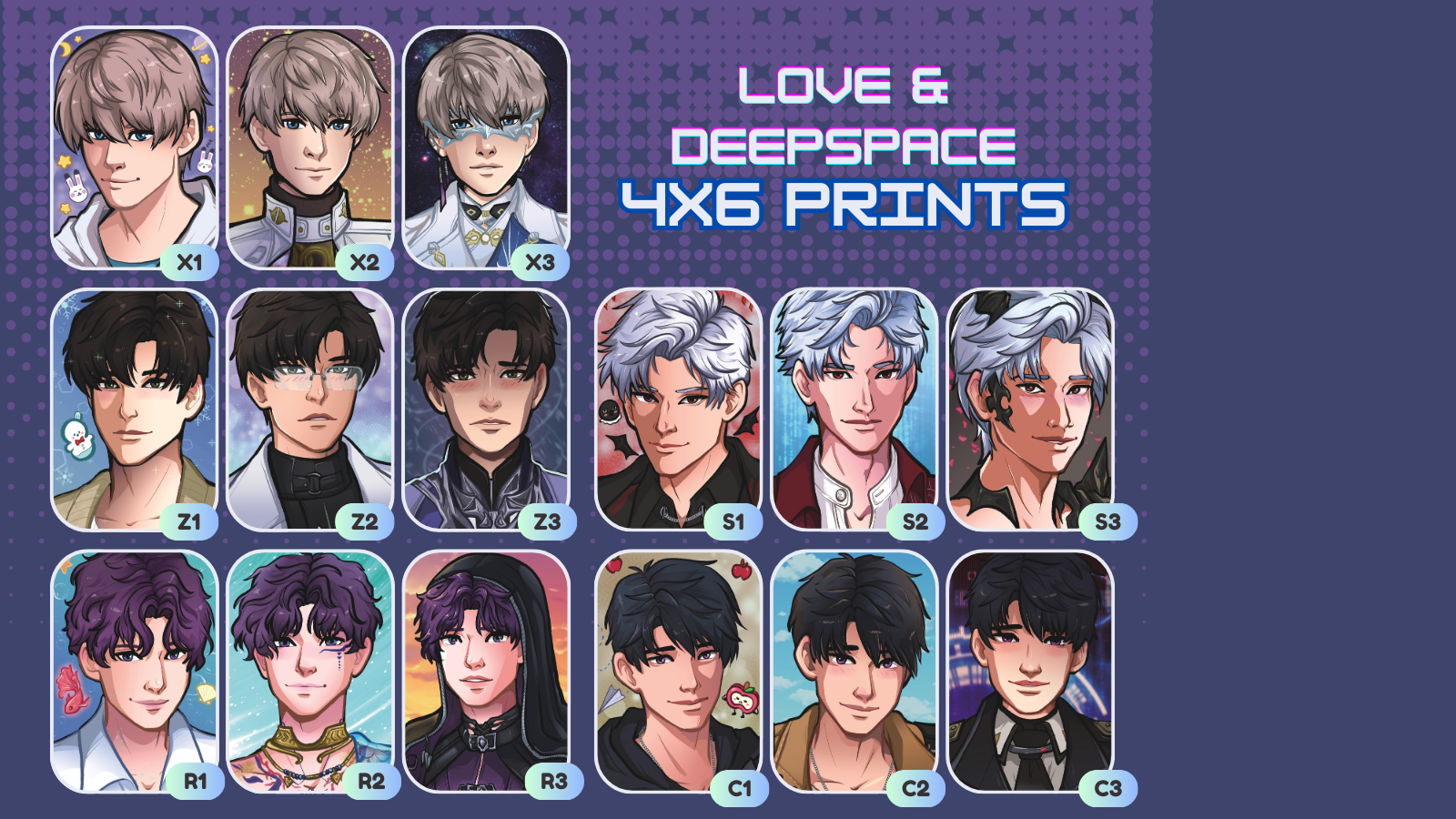 4x6" Matte Prints featuring the five love interests from the scifi otome game "Love and Deepspace" - can be purchased as singles, trios, or a mix/match of 6 for a discount!